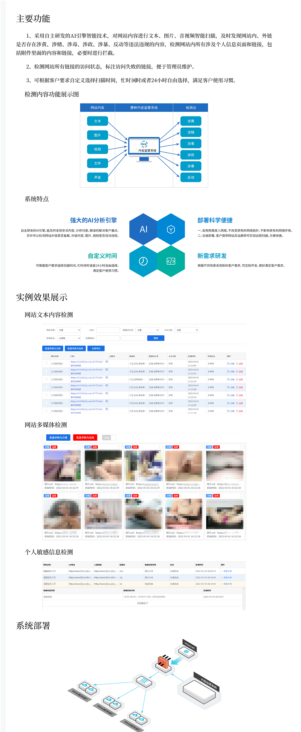 网站内容检测、网站外链检测、个人敏感信息检测等服务,对网站内包括文本、图片、音视频等内容通过AI检测及智能分析出违法违规内容,及时进行处理,为网站合规保驾护航。